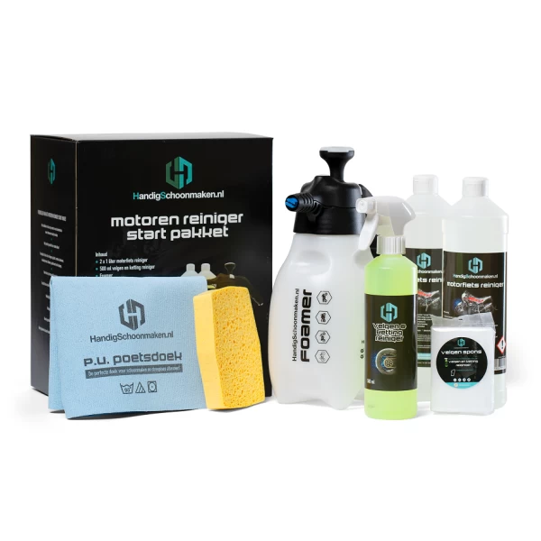 Met deze motorreiniger-startset heb je meteen alle schoonmaakspullen voor je motor bij elkaar. De beste keuze als je jouw motor weer wilt laten glimmen! Wil je jouw motor zomerklaar maken? Of heb je de laatste tijd veel gereden? Met deze producten staat je motor straks weer te glimmen. De set bestaat uit: foamer, 2 ltr motorreiniger, 0,5 ltr velgen- en kettingreiniger, viscosespons, velgenspons en een P.U. poetsdoek.